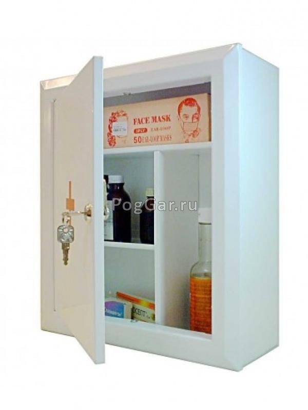 Корпус аптечки металлический, со стеклянной дверцей, для хранения лекарств и средств первой медицинской помощи.